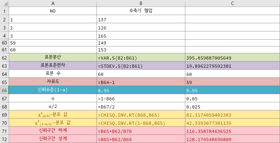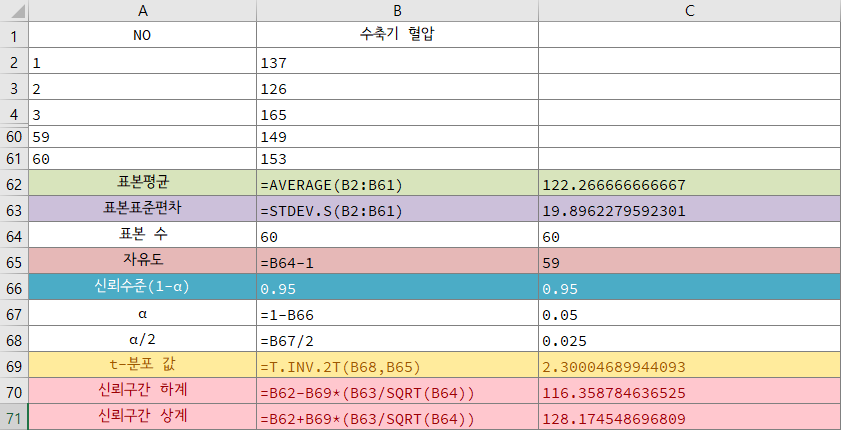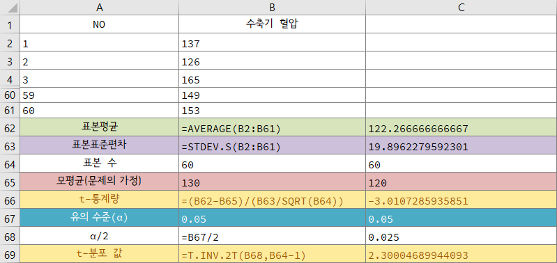 모평균이 \(130\textrm{mmHg}\)이고, 표본 수가 \(60\)일 때, 통계량 \(t\)의 값은 다음과 같다.